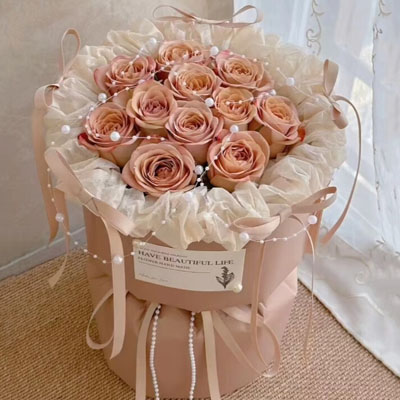 【豆蔻年华】精选99朵顶级香槟玫瑰,花面用香槟色英文缎带装饰。