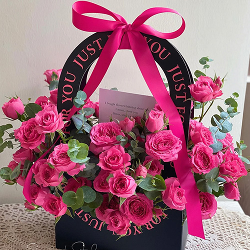 【遥月】9枝精品香槟玫瑰,3朵白玫瑰,6支白桔梗(断货则用6朵白玫瑰代替),绿色小雏菊、栀子叶、大排草装饰,精美绿色缎带蝴蝶结。