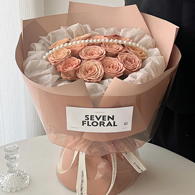 【难忘旧时光】精选13枝卡布奇诺玫瑰,1条珠串,白色纸内衬,同色系小香风包装。