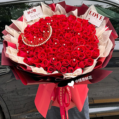 【此情可待】精选99枝红玫瑰,1个皇冠(款式随机),1条灯带,珍珠装饰花面。
