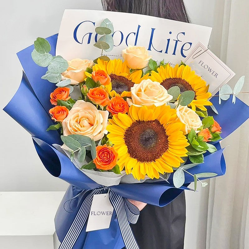 【志存高远】3支向日葵,8朵香槟色玫瑰,搭配5支橙色多头小玫瑰(断货则用5支洋桔梗代替),尤加利叶间插装饰。