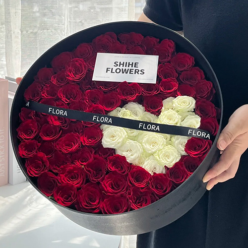 【倾心爱一世】精选60枝红玫瑰,15枝白玫瑰(白玫瑰心形造型),一条缎带装饰花面。