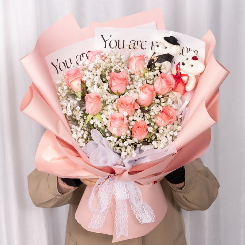 花材: 11枝戴安娜粉玫瑰,1对小熊,1条灯串,搭配白色满天星、尤加利叶丰满间插。