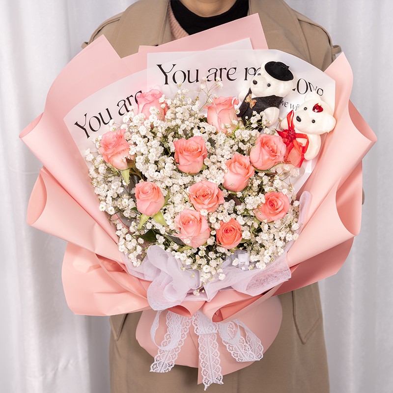 花 材:11枝戴安娜粉玫瑰,1对小熊,1条灯串,搭配白色满天星、尤加利叶丰满间插。