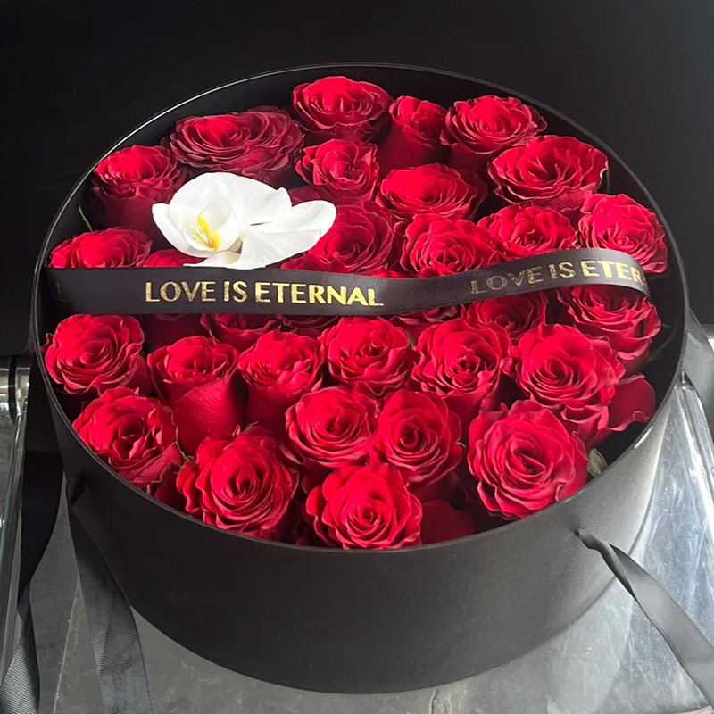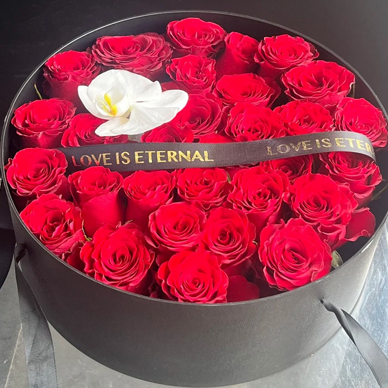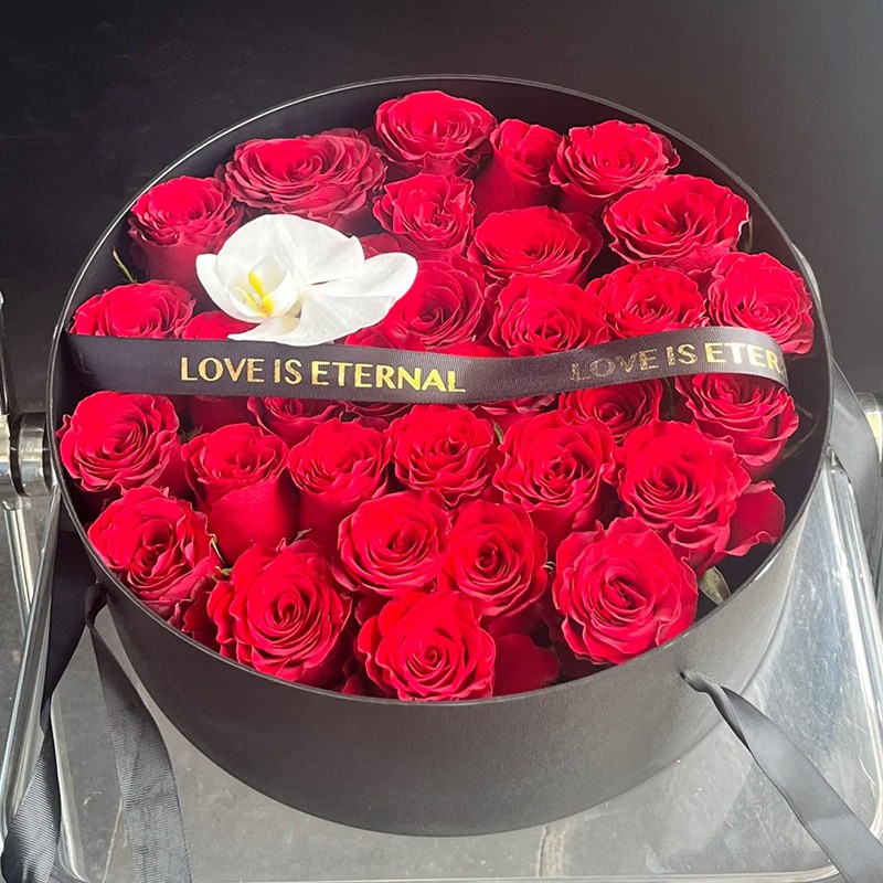花材: 精选33枝红玫瑰,1朵蝴蝶兰,黑色英文缎带装饰花面。