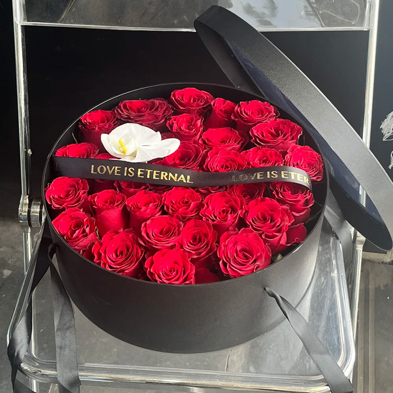 花 材:精选33枝红玫瑰,1朵蝴蝶兰,黑色英文缎带装饰花面。
