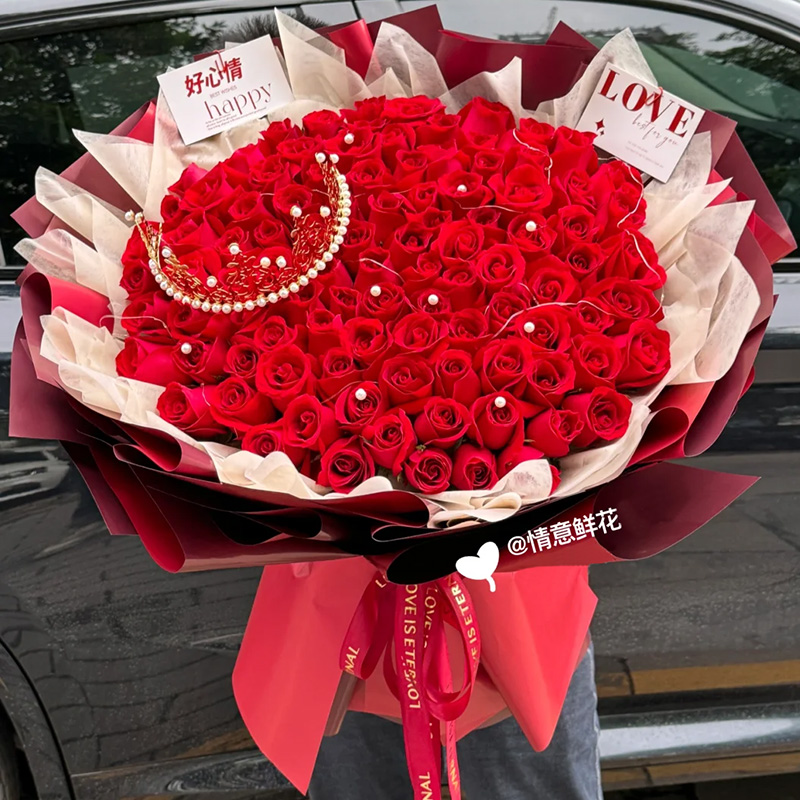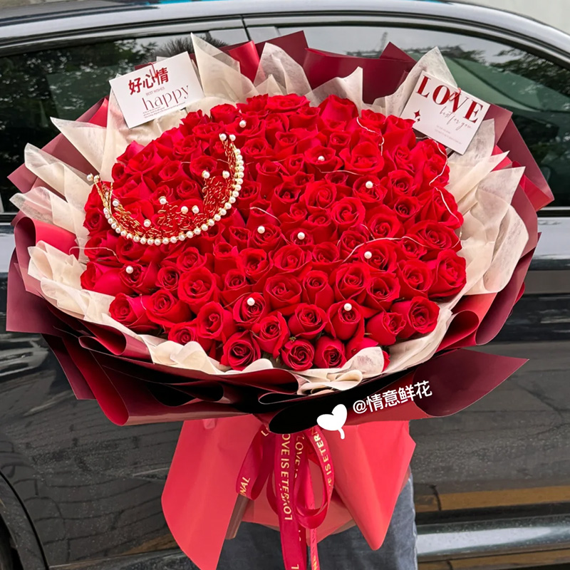 花材: 精选99枝红玫瑰,1个皇冠(款式随机),1条灯带,珍珠装饰花面。