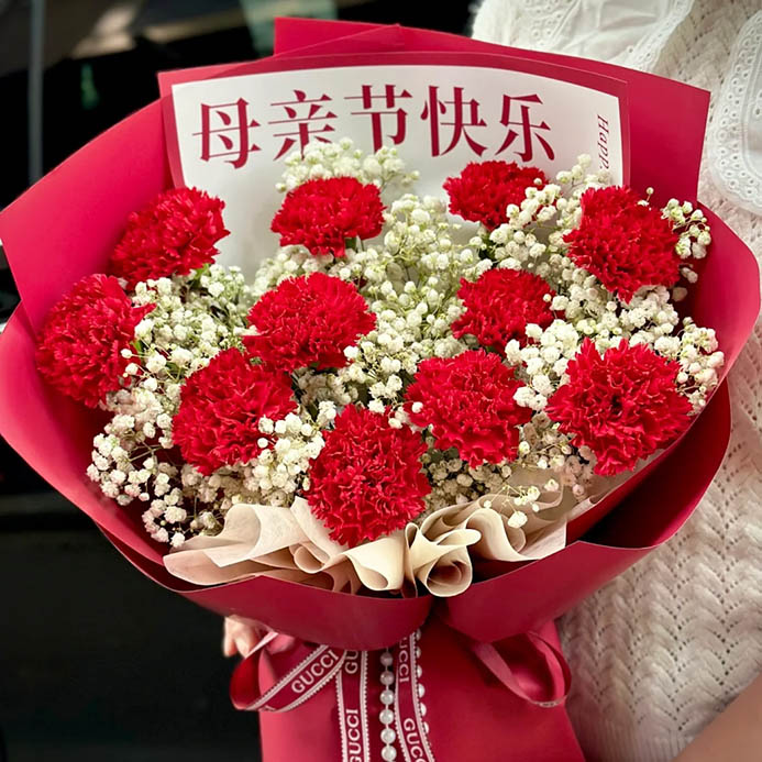 花 材:11枝红色康乃馨,搭配白色满天星丰满间插。