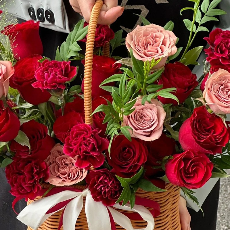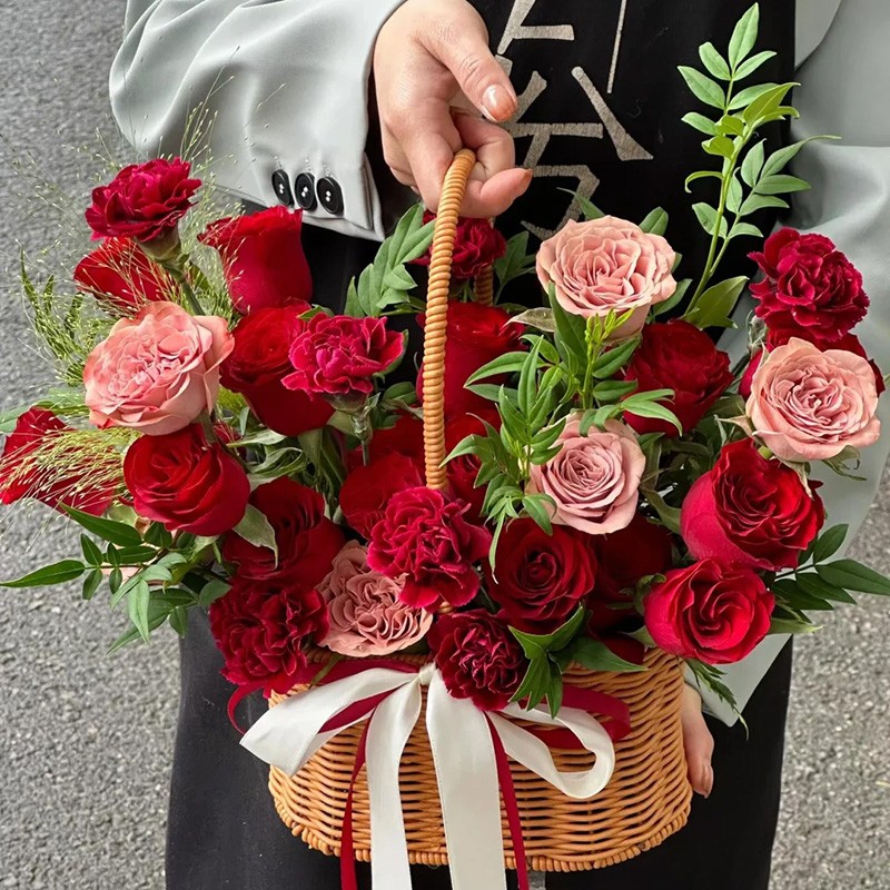 包装: 精美手提花篮,提手处用红色、香槟色丝带系蝴蝶结装饰。(篮子和配饰等具体以当地实物为准)