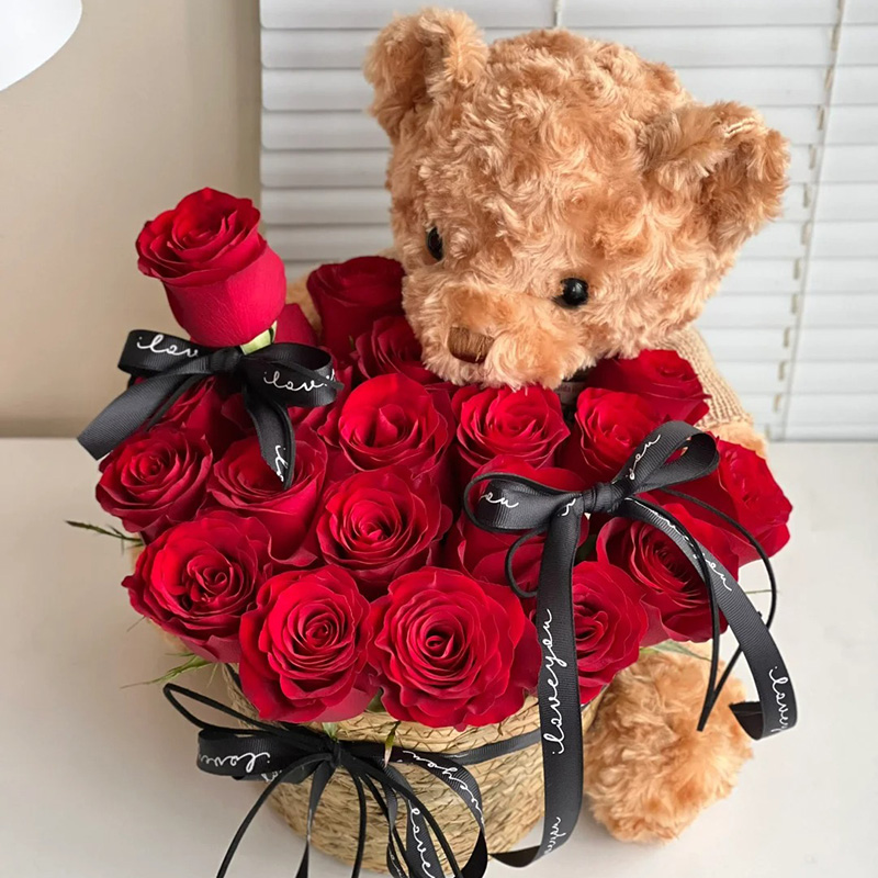 花材: 19支精品红玫瑰,搭配蝴蝶结装饰花朵和篮筐。