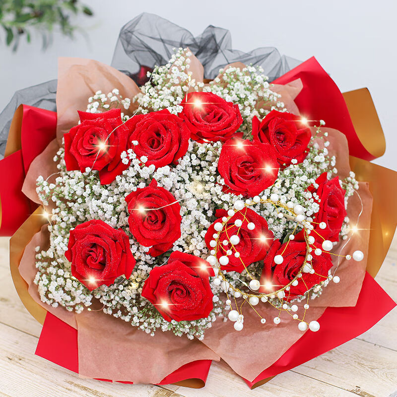 花材: 11枝红玫瑰,1个珍珠皇冠(款式随机),1条串灯,搭配白色满天星。