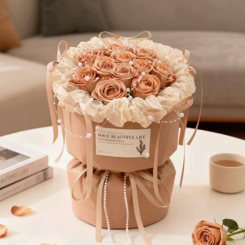 花材: 精选11枝卡布奇诺玫瑰,珠串装饰花面花体,5支同色系蝴蝶结围绕包装装饰,白色纸内衬,同色系小香风包装,珠串和同色系缎带花结。