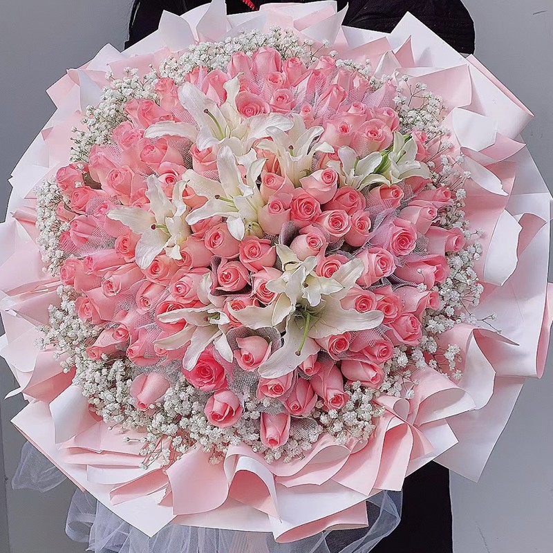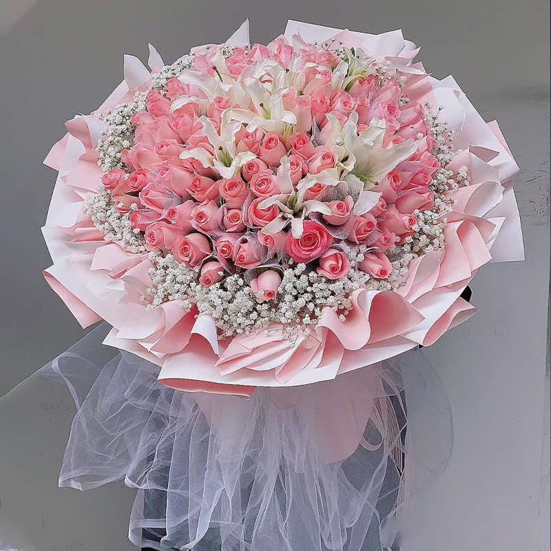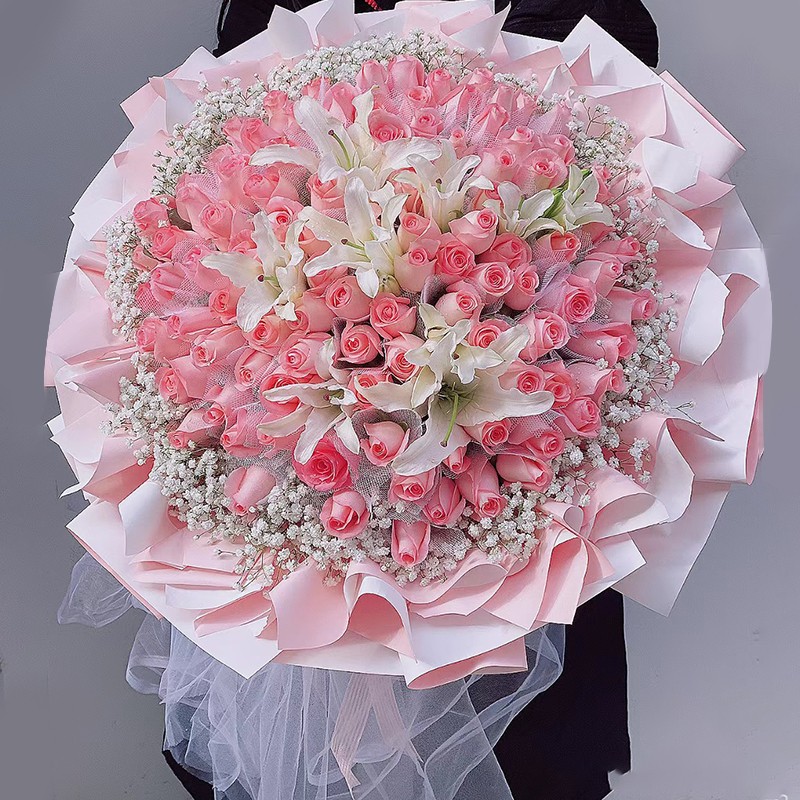 花材: 99朵戴安娜粉玫瑰,4枝多头白色香水百合,满天星环绕装饰。