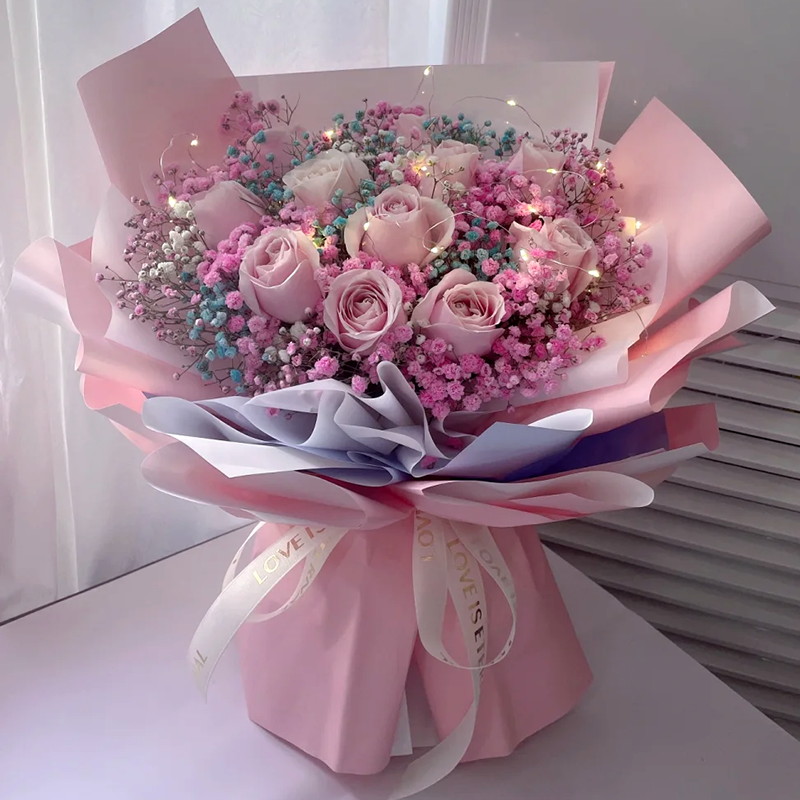 花材: 11枝戴安娜粉玫瑰,1条灯带,搭配多色满天星丰满间插装饰。