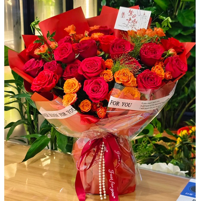 花材: 19枝卡罗拉红玫瑰,6枝多头橙色泡泡,搭配喷泉草(或尤加利叶)装饰。